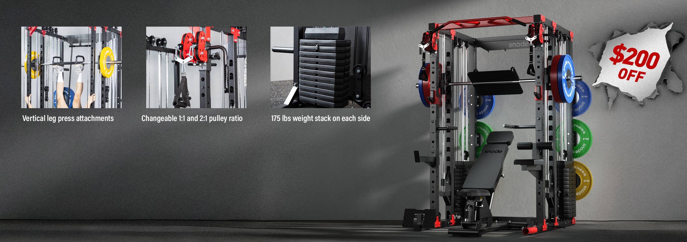 Equipped 350 lbs weight stack + dual 1:1 and 2:1 pulley ratio + 17 free attachments included