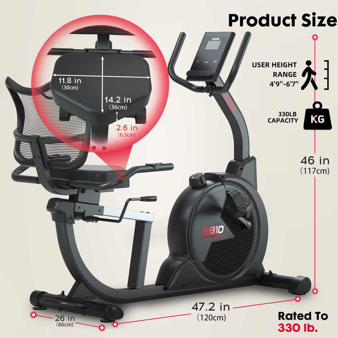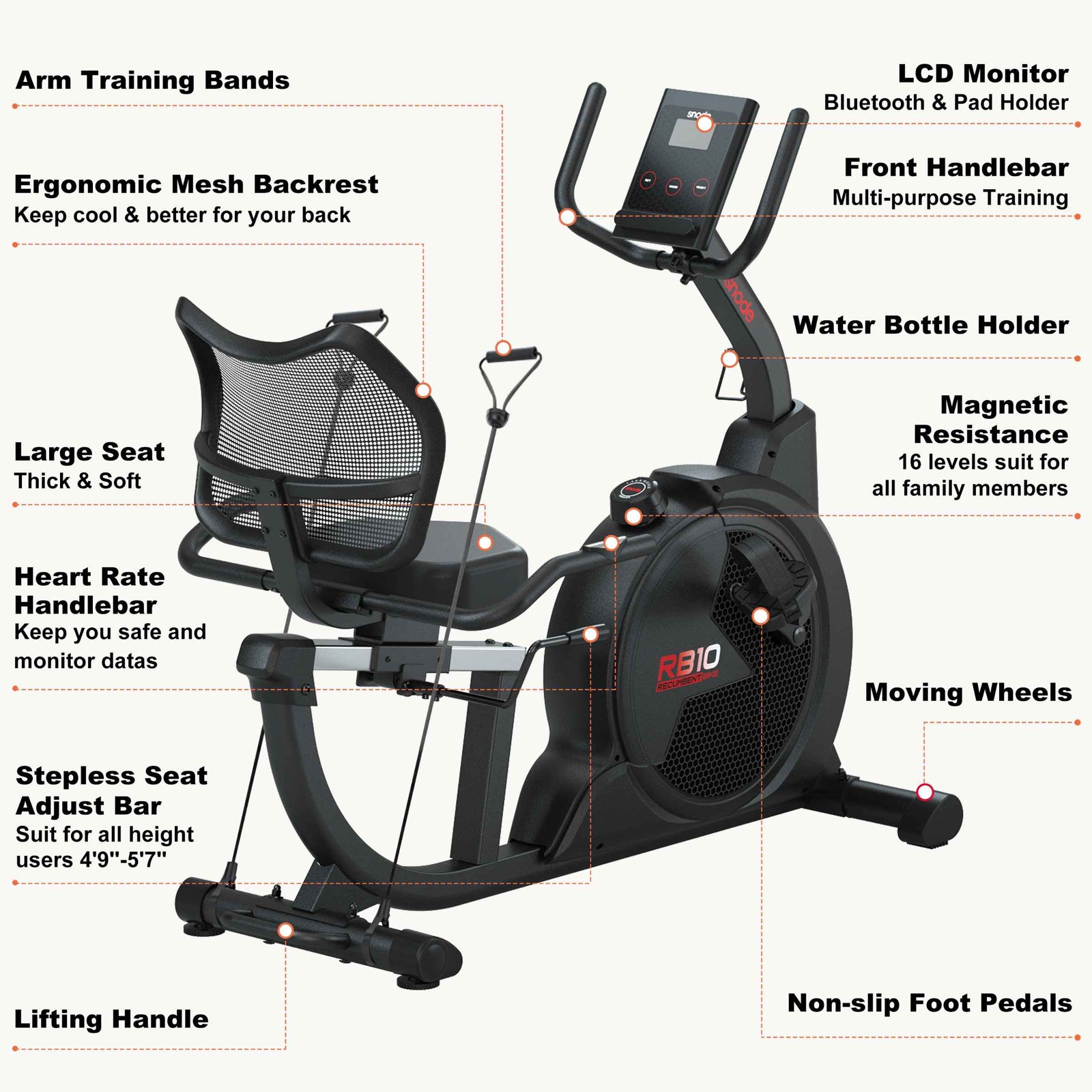 【Recumbent Bike for Home】 Enjoy a comfortable and effective workout with our SNODE RB10 Recumbent Bike. With 16 levels of magnetic resistance, you can customize your exercise intensity to suit your fitness level. The LCD monitor tracks your workout progress, including time, distance, speed, and calories burned, providing you with the motivation you need to reach your goals.