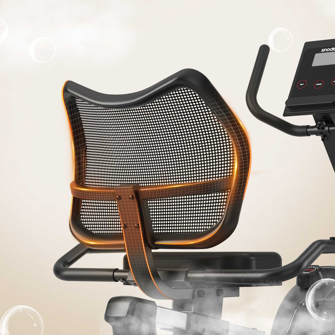 【Ergonomic Breathable Backrest】The ergonomic design of the SNODE Recumbent Bike ensures an enjoyable workout experience. The ergonomic breathable backrest cushion provides support and comfort for your back, while the padded seat and handlebars offer a comfortable grip and position. The adjustable seat height and reclining feature allow you to find the perfect position for your body.