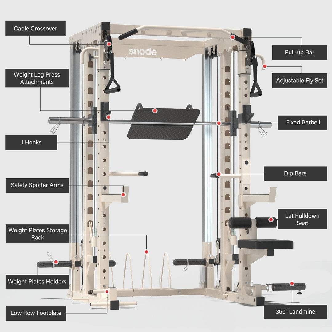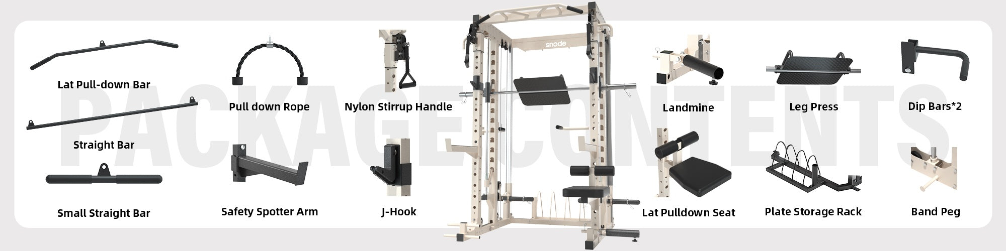 Snode ALL10 Pro Functional trainer includes all the attachments shown in the image, allowing you to craft your ideal home gym.