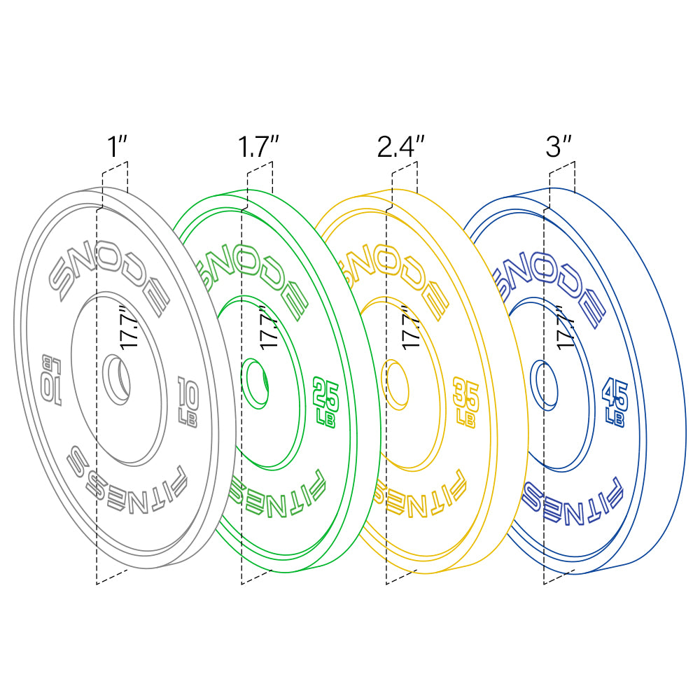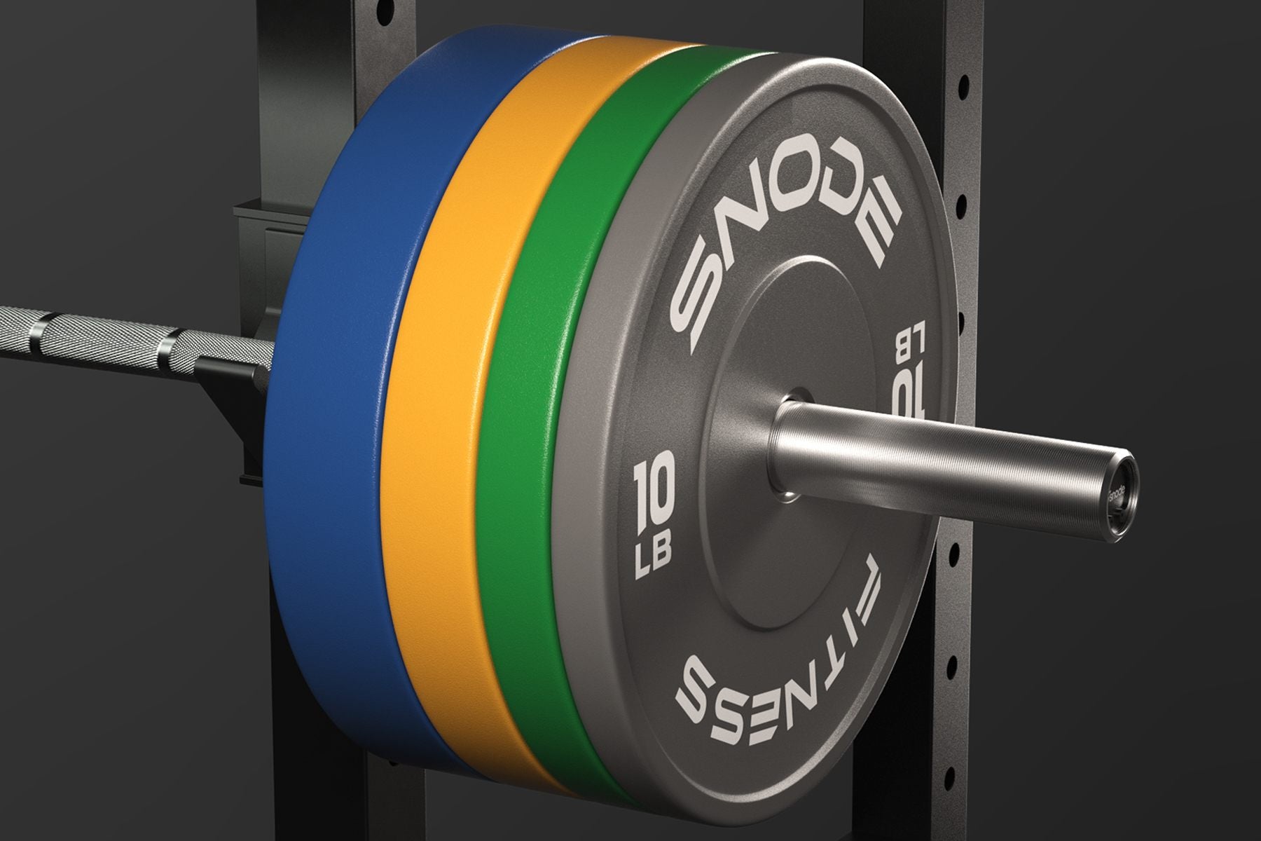 Snode Bumper Plates come in 4 vibrant colors (Blue/45LB, Yellow/35LB, Green/25LB, Gray/10lb). These high-quality bumper plates are designed to enhance your workout experience and provide a reliable and durable solution for your weightlifting needs.