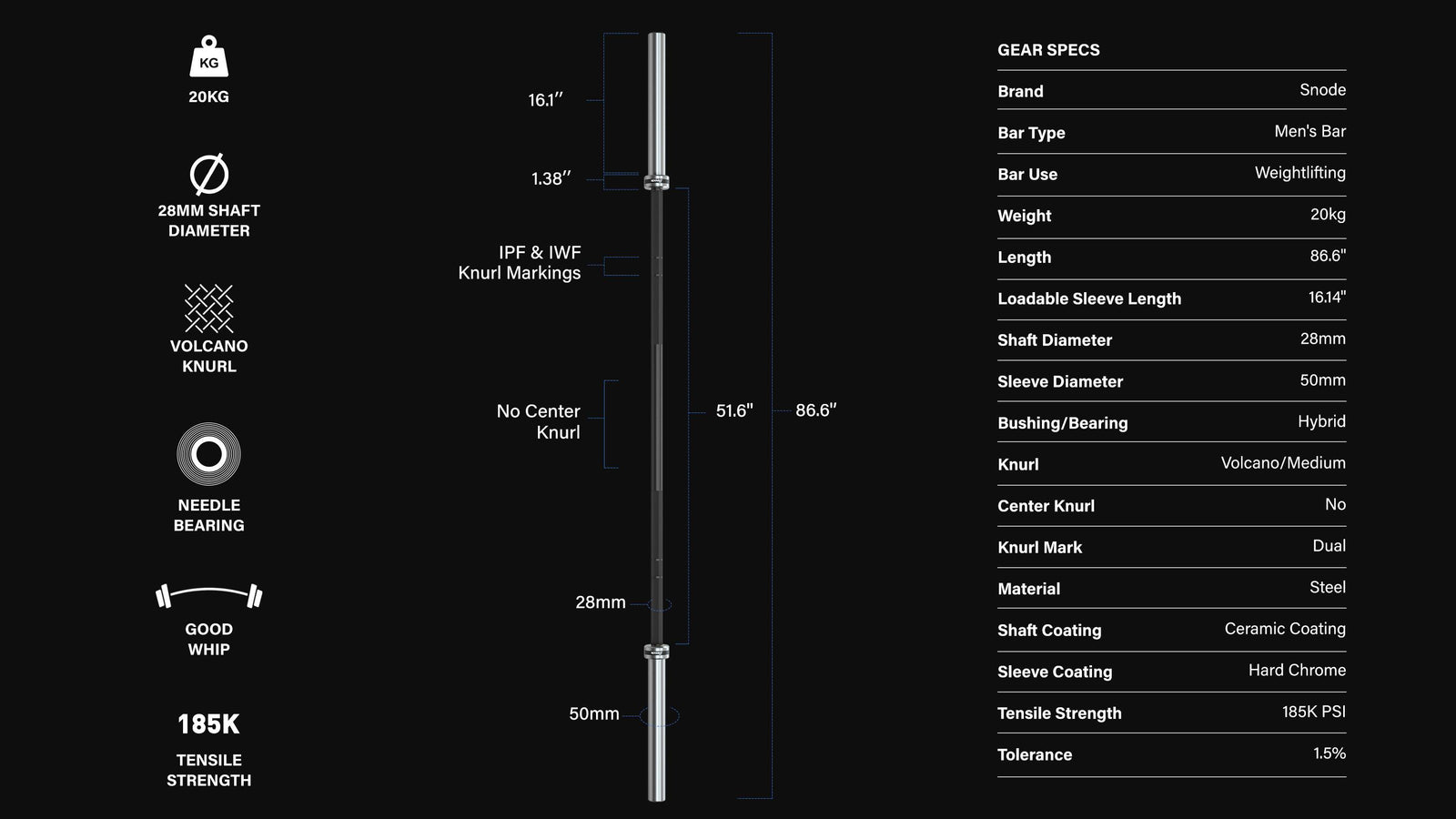 This barbell is made of steel for perfect durability and performance. The 185,000 PSI shaft with dual knurl markings(IWF&IPF), which can help you determine the placement on the barbell. Volcano/medium knurling adds the friction and provides a good grip without tearing up your hands while training. Designed for weightlifting.