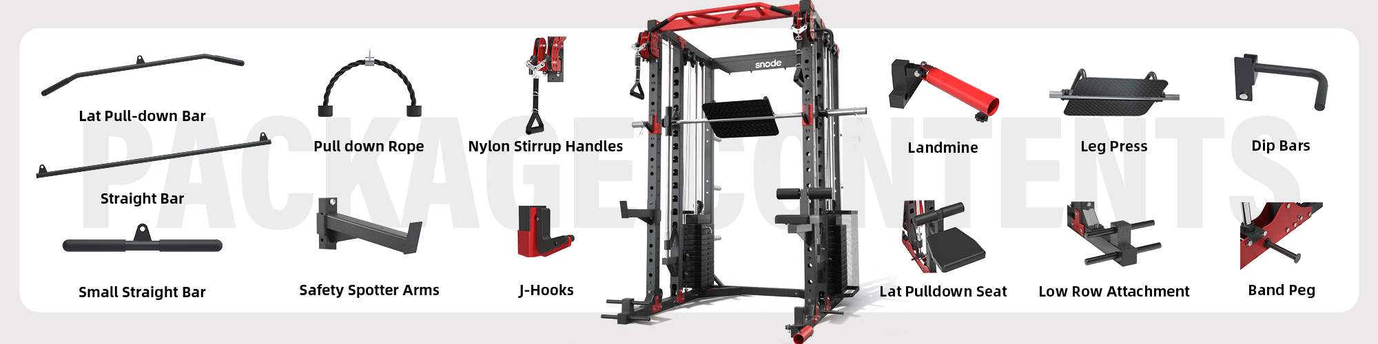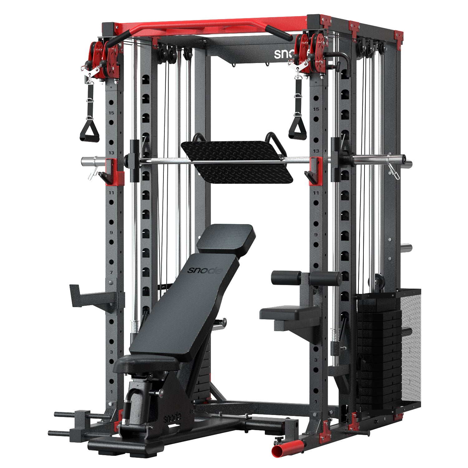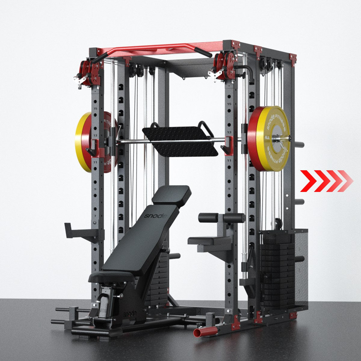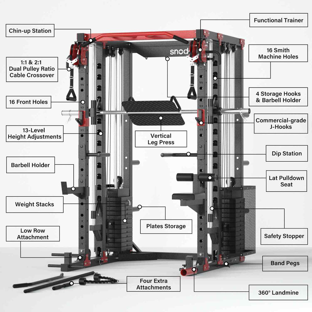 Tired of feeding the bottomless pit of Smith Machine add-ons? Snode ALL10 Pro with 350LB Stack Smith Machine is the ultimate solution! With one single, smart purchase, you get EVERY accessory and 350LB weight plate pictured—nothing else to buy. One thoughtful investment, a lifetime of training.