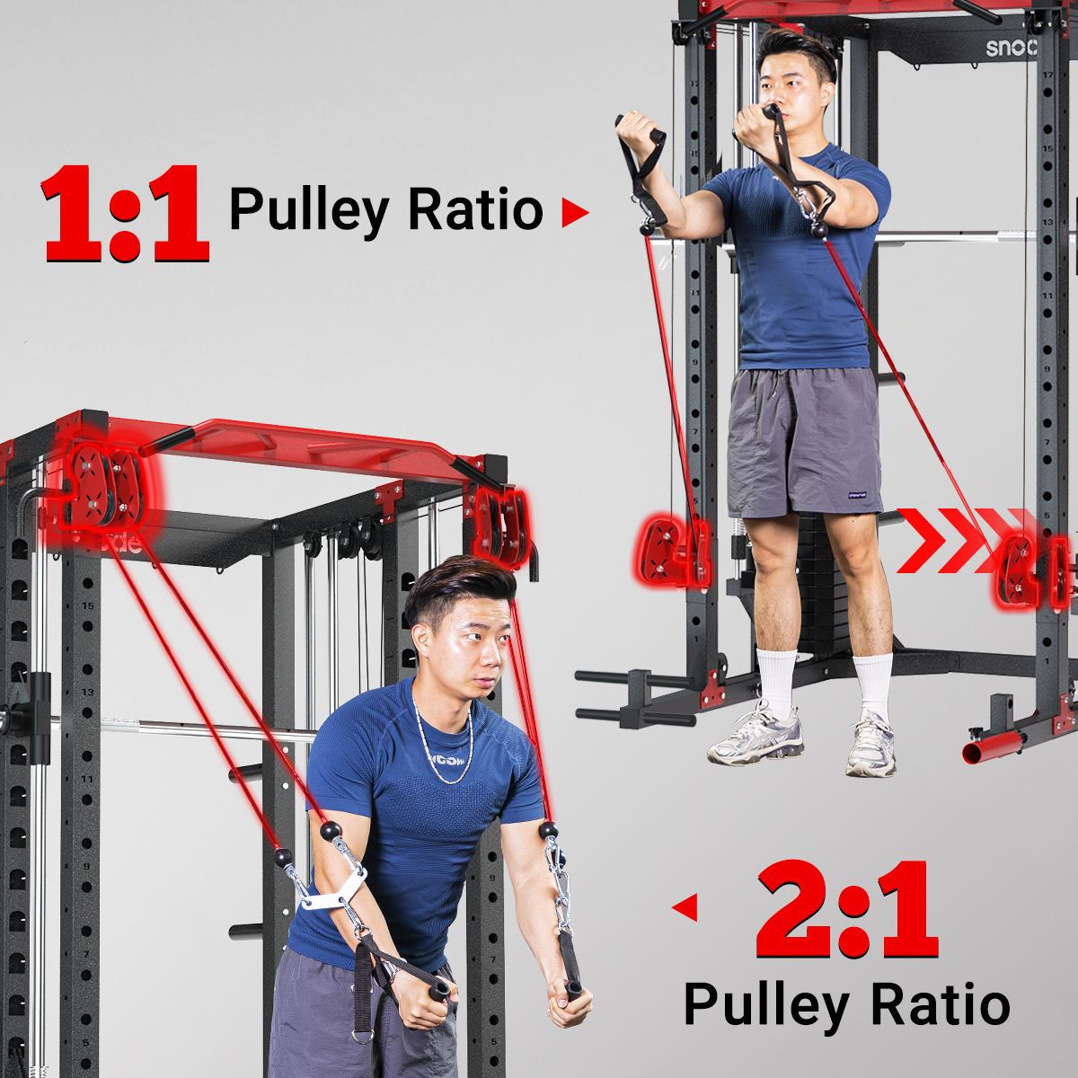 - A 2:1 pulley ratio means that the resistance you feel at the handle of a cable machine is half of the weight you've selected on the weight stack (50lbs feels like 25lbs to move), delivers smoother movement, longer range, and better control, perfect for functional training, rehab, or Isolation exercise