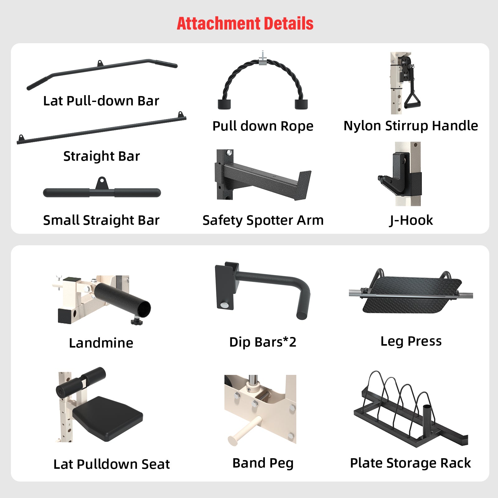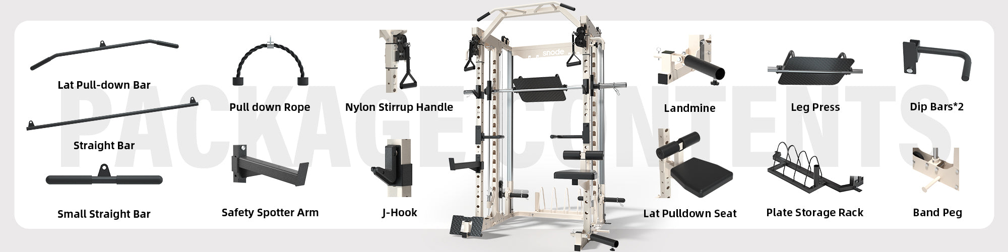 Snode ALL10 Pro Functional trainer includes all the attachments shown in the image, allowing you to craft your ideal home gym.