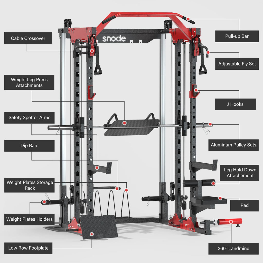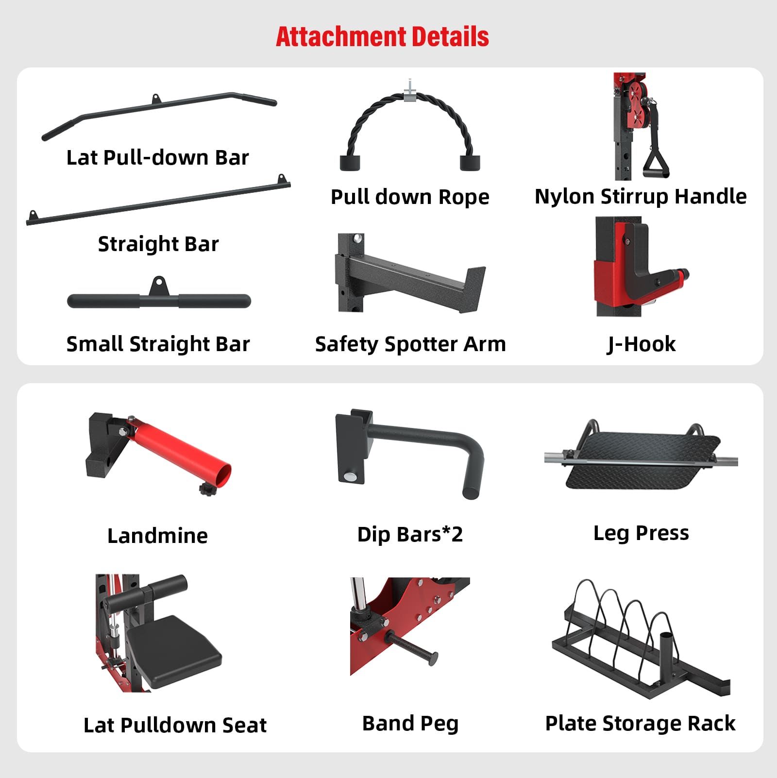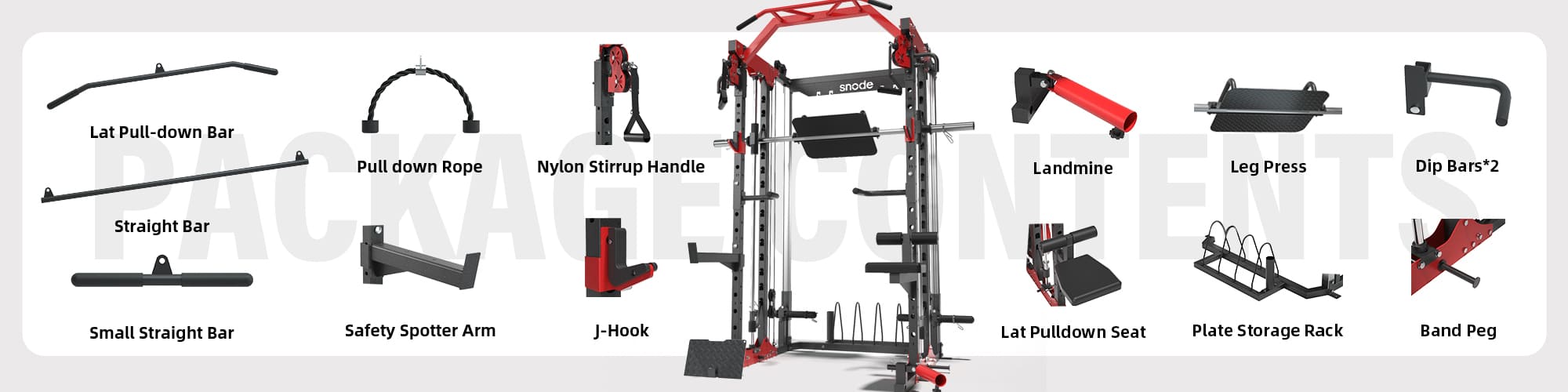 Snode ALL10 PLUS Functional trainer includes all the attachments shown in the image, allowing you to craft your ideal home gym.