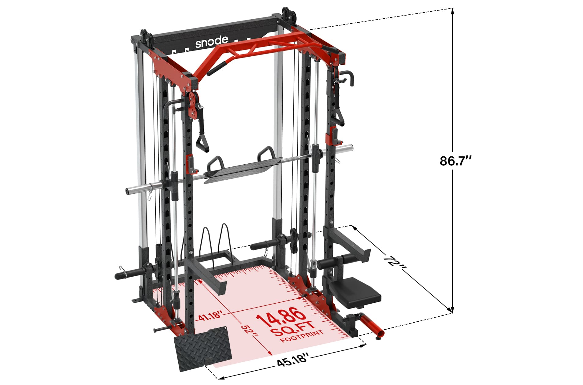 This versatile functional trainer combines a Power Rack, Smith Machine, Pulley System, and Hack Squat Machine into one compact design. The frame is made of 2'' x 2'' 14-Gauge Steel and reinforced with a durable powder-coated finish to withstand long, intense use. This all-in-one system gives you everything you need for a full-body workout, like bench press, squats, rope pull down, seated rowing, bicep curls, calf raises, cable cross overs, over head presses, pull-ups, and more. The compact design only takes up 14.86 square feet of space, and it comes with a barbell plate holder to keep your home gym organized so you don’t waste time cleaning up messy floors. Experience the ALL10 Smith Machine's independent and dual pulley system, enjoy quality time and double the fun as you achieve your fitness goals together.