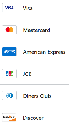 The available credit card options are listed above. The credit card companies listed above are the most commonly used credit cards on this website.