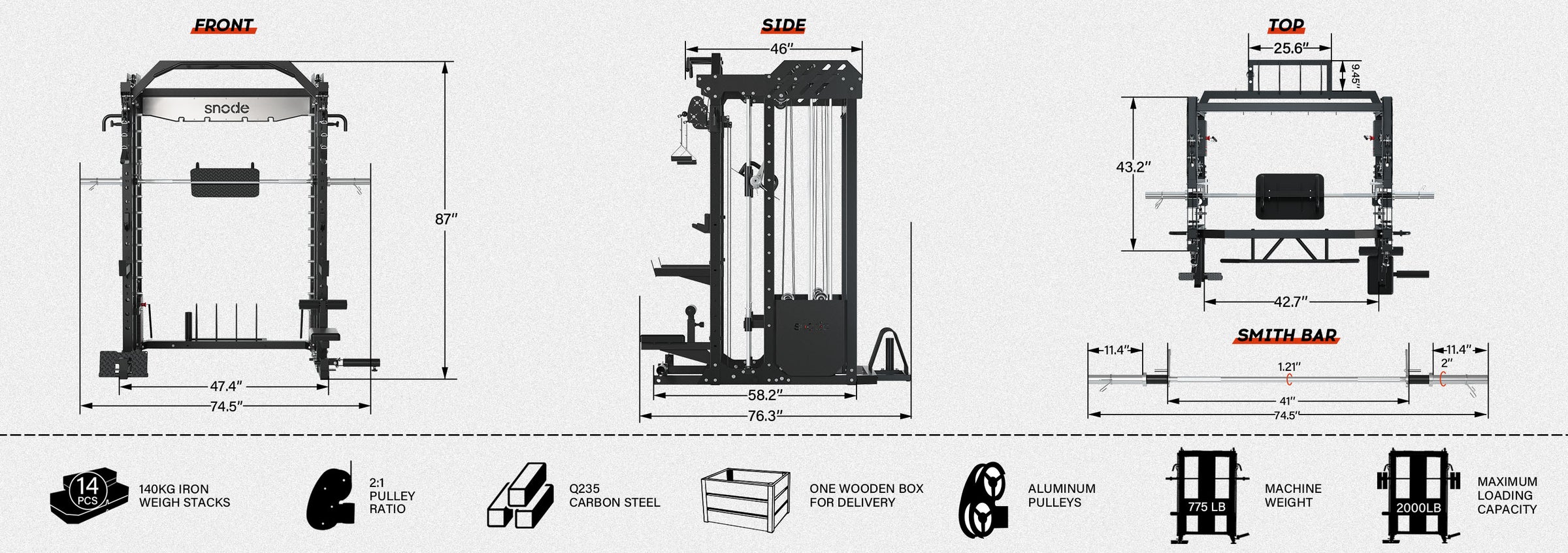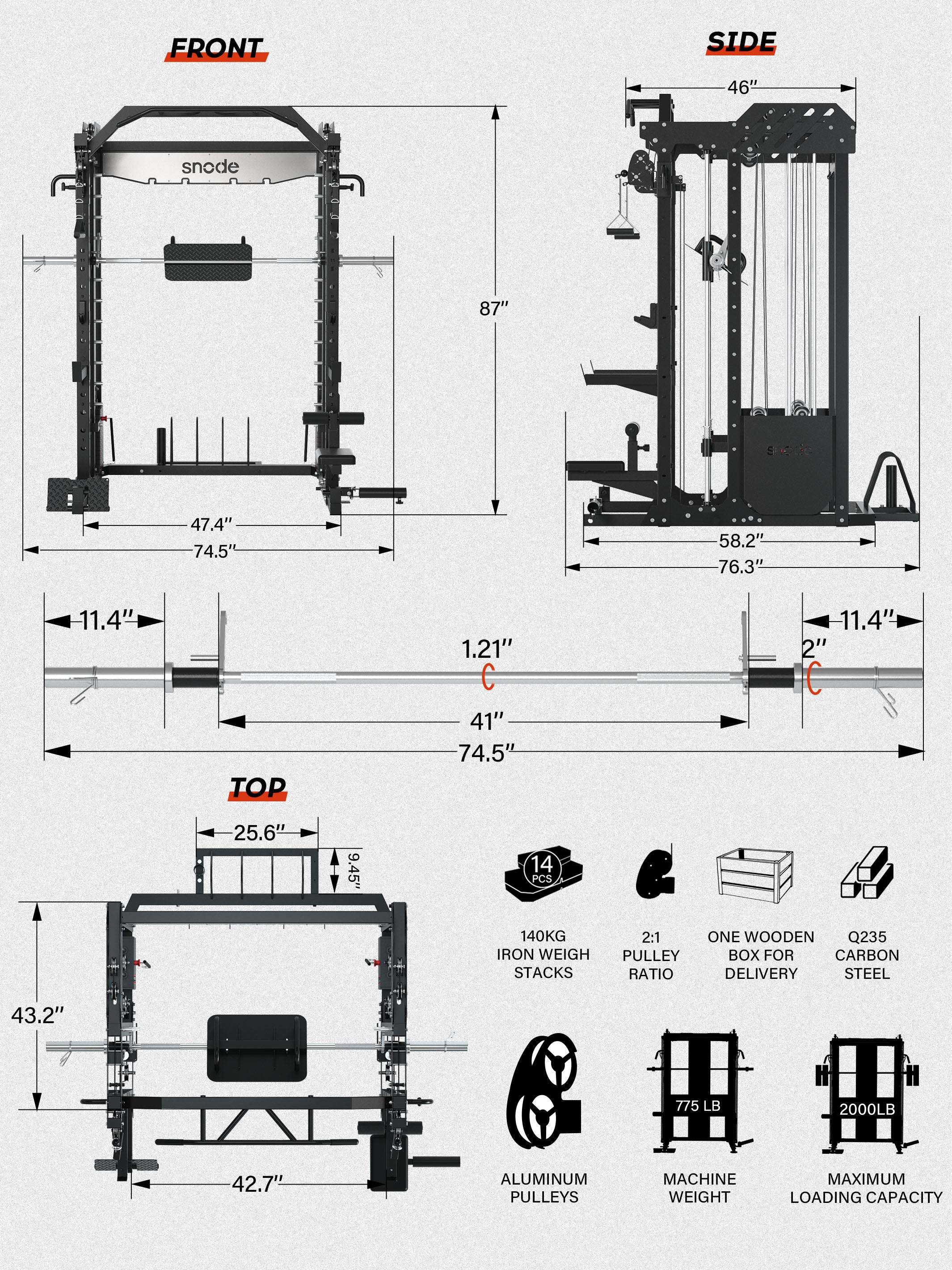For the Snode Smith Machine All-In-One Pro. To properly fit it in your home gym, ensure you have a space of at least 16.6 square feet. This space accounts for the equipment's dimensions (74.5 inches long by 76.3 inches wide and 87 inches high) and provides adequate clearance around all sides for safe use and accessibility. This setup will allow you to fully utilize all its features comfortably and safely.