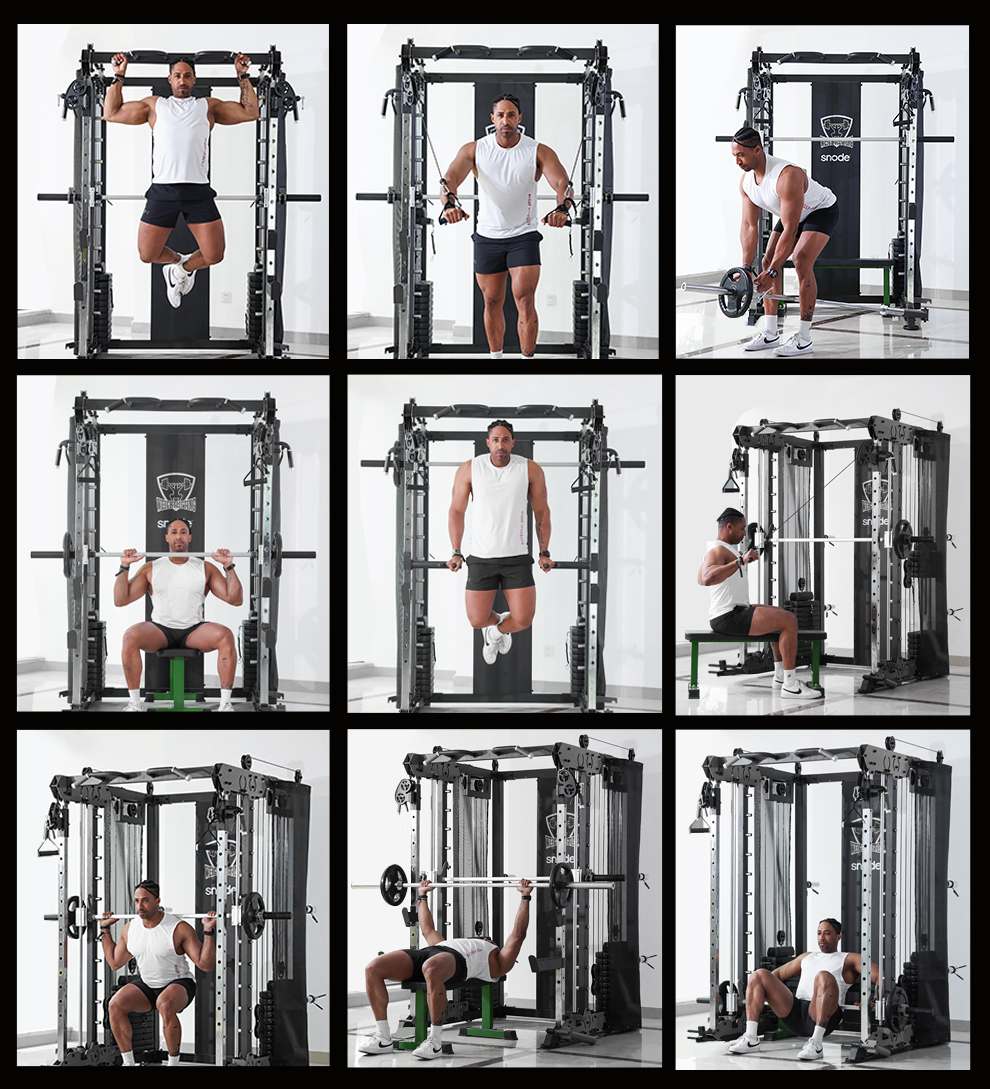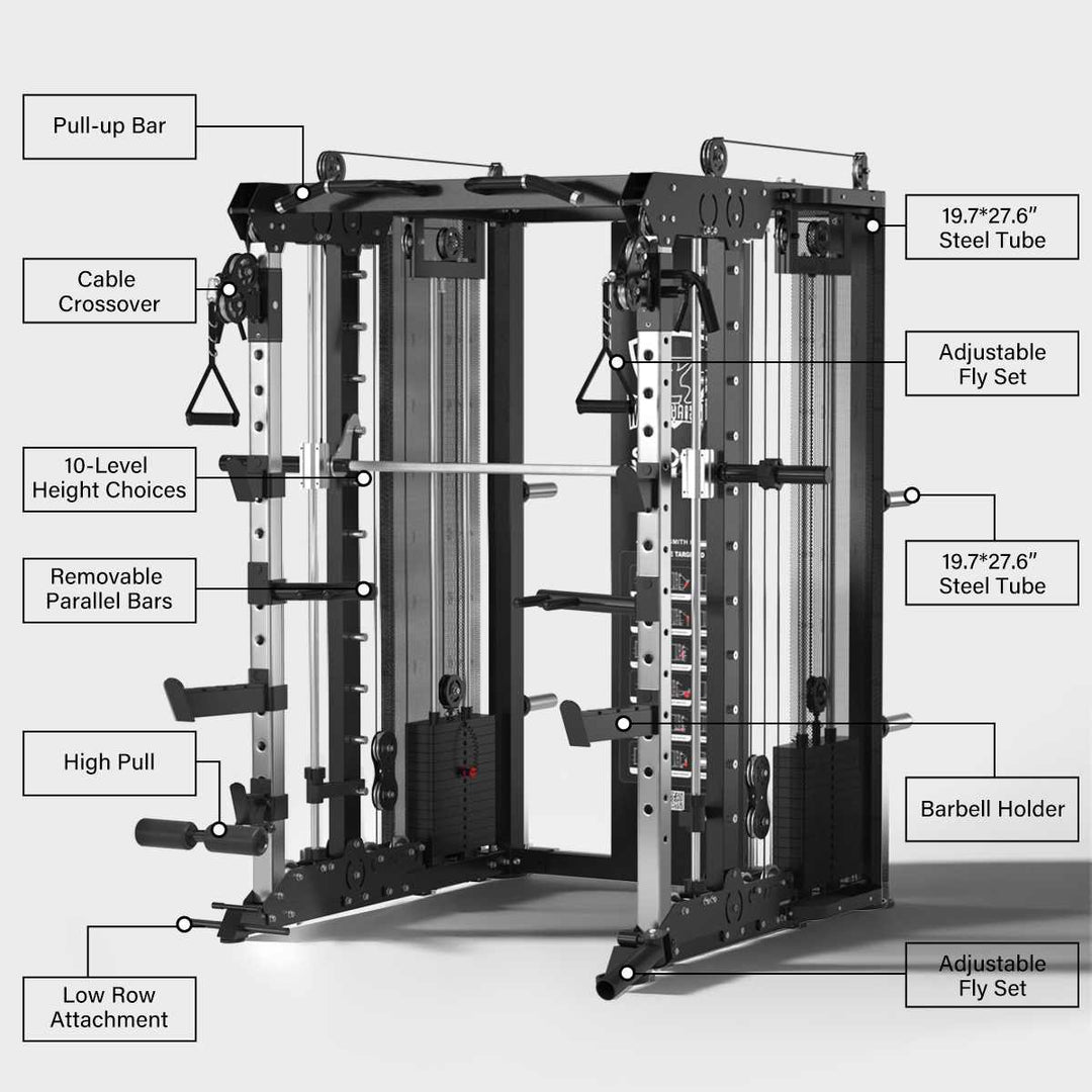 This all in one machine starts with the functional trainer basics. Then, we added 10 strength training stations including Smith Machine, Power Rack , Suspension Trainer, Dip Station, Low Row, Leg Developer, Squat Machine and Landmine Core Trainer. No need to buy any other extras, just one step.