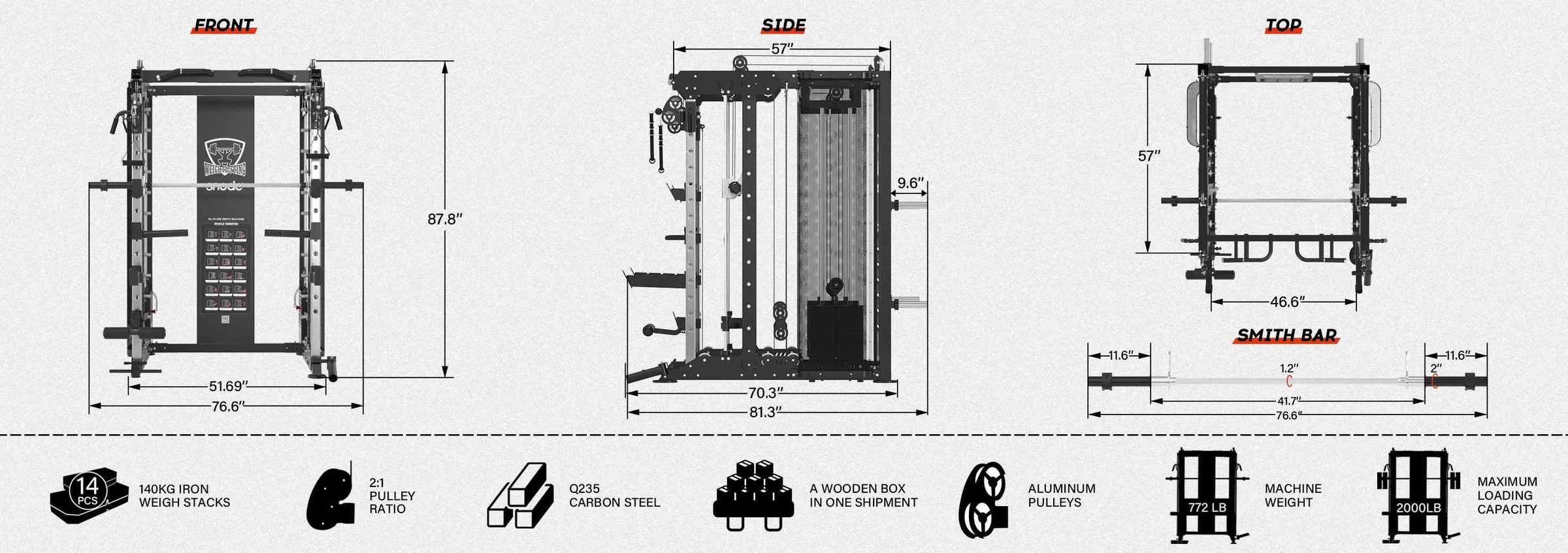 Our most popular Smith Machine is a full-featured beast - combining up to 10 strength training stations into a single Power Rack. Bring the entire fitness experience to your home. This complete training system features innovative construction, combining arm and leg stations for strengthening different muscle groups and getting a comprehensive workout without switching between gym equipment. The main frame is constructed from solid 3x3 inch 11 gauge steel. It supports a rackable capacity of up to 900 lbs. The integrated dual 70KG pin-selected iron weight stacks, aircraft quality cable, smooth and stable linear bearing system and a plethora of accessories make it a fully functional product that is perfect for commercial and home gyms.