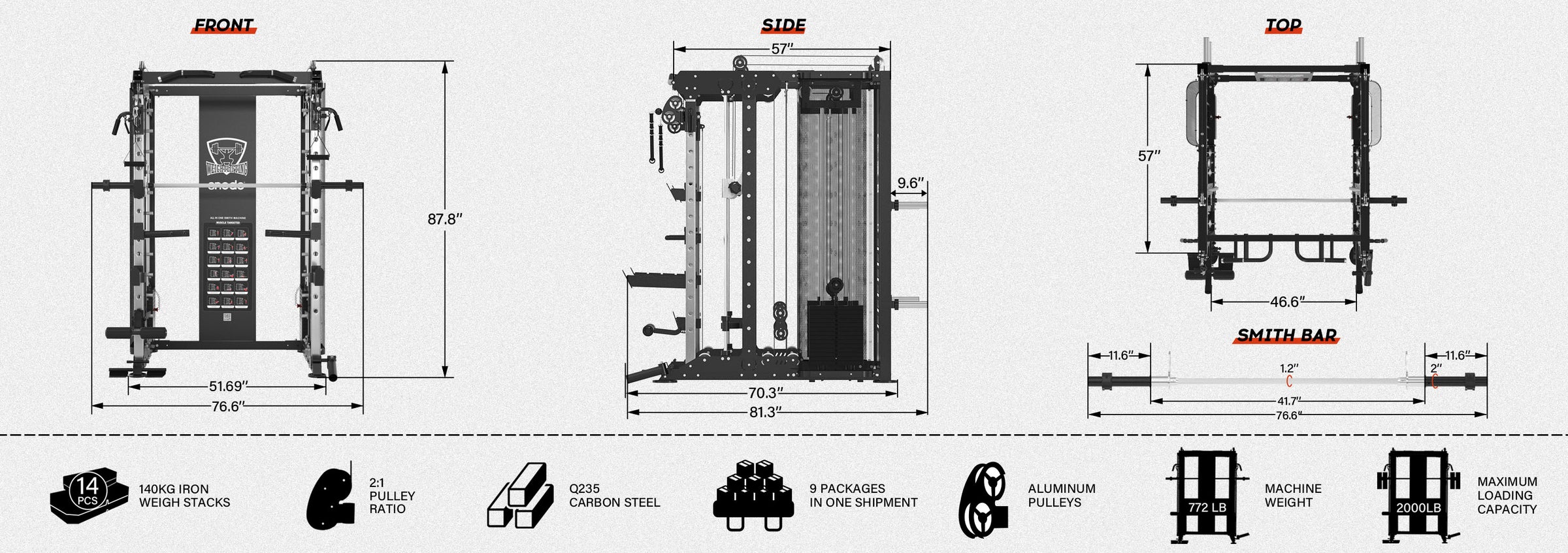 Exterior(Including Smith Bar): 76.6 in (W) x 81.3 in (D) x 87.8 in (H)