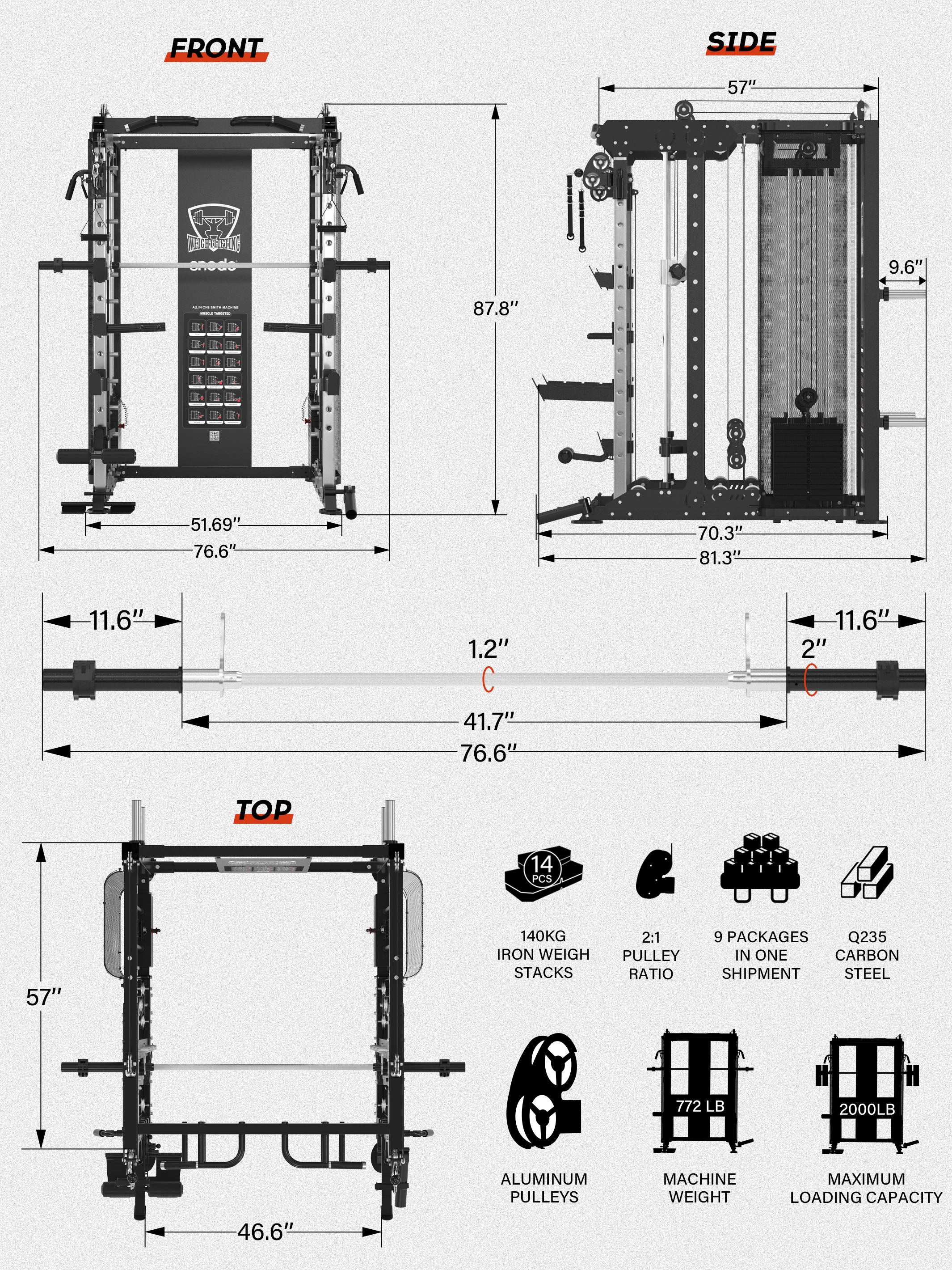 Take the Snode Smith Machine All-In-One Functional Trainer. To properly fit it in your home gym, ensure you have a space of at least 12 feet by 12 feet. This space accounts for the equipment's dimensions (78.7 inches long by 76.4 inches wide and 87.8 inches high) and provides adequate clearance around all sides for safe use and accessibility. This setup will allow you to fully utilize all its features comfortably and safely.